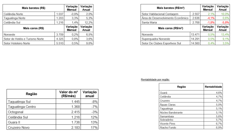 Além disso, o Cruzeiro Novo, em maio, ficou como a região com maior incremento de preço de aluguel interanual. Taguatinga Sul, por sua vez, obteve um maior retrocesso.