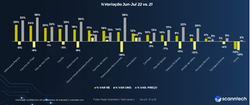 O estudo mostra que, em termos de participação na cesta total de vendas em supermercados e atacarejos de todo o Brasil, a Cesta Junina foi mais importante no mês de junho, tanto em 2021 como em 2022.