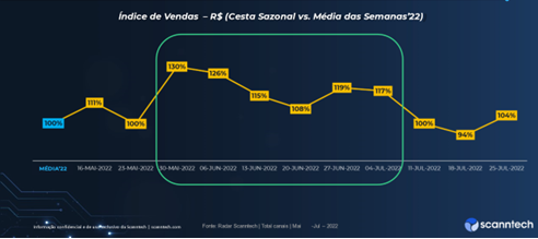 A venda da Cesta Sazonal concentrou-se nas semanas de junho se estendendo até a primeira semana de julho, em 2022. Amendoim, doces industrializados prontos, grãos (canjica) e vinho foram destaques durante todo o período sazonal, tendo os dois últimos itens apresentado incremento de vendas já no final de maio do ano passado.