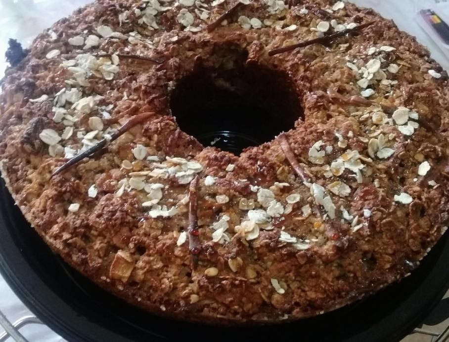 Amasse as bananas com um garfo, acrescente a maçã ralada, o açúcar, os ovos e mexa bem, coloque o cacau, a canela, aveia, mexa mais um pouco, coloque o fermento, mexa e após ter uma massa cremosa, coloque em um pirex ou forma untada de com manteiga de coco ou óleo vegetal. Decore com rodelas de banana, tiras de maçã e aveia. Leve ao forno pré-aquecido em 180 ° Por aproximadamente 30 minutos.