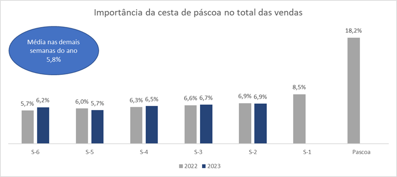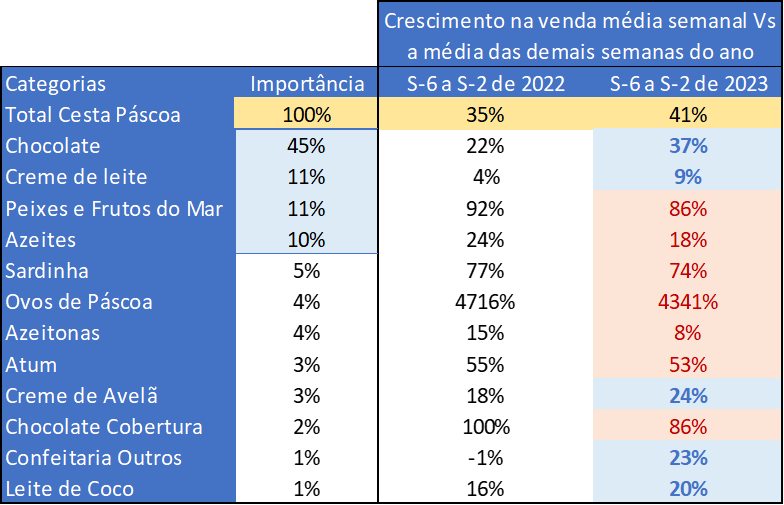 Em 2022 a cesta dos produtos de Páscoa cresceu 35% no período de seis a duas semanas que antecedem a data comemorativa em relação à média das demais semanas do ano. Em 2023 este índice ficou em 41%. Chocolates puxaram este crescimento da cesta de Páscoa em 2023, já que no ano passado tinham crescido 22% no período e este ano cresceram 40%, seguidos do creme de leite, que no ano passado cresceu 4% contra 9% este ano. Todas as demais categorias da cesta de Páscoa reduziram seu crescimento neste período contra a média do ano.
