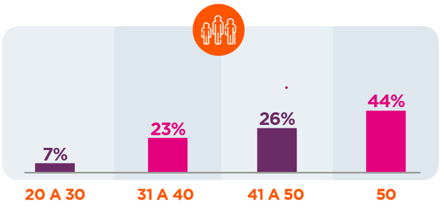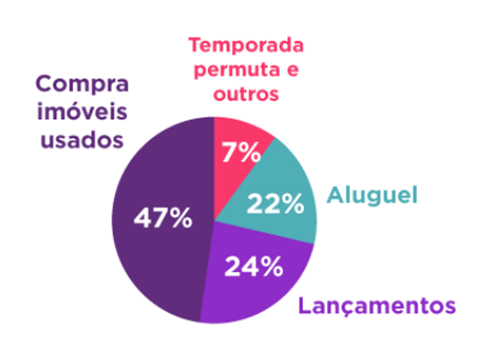 Atualmente, a busca de imóveis é feita majoritariamente por mulheres (64%), sendo que os homens representam 36%. As faixas etárias são as seguintes: