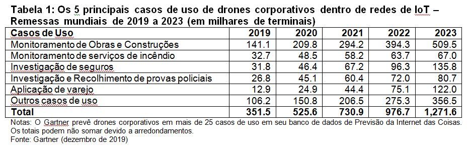 As vendas mundiais de drones para uso corporativo integrados às redes de Internet das Coisas (IoT) chegarão a 526.000 unidades em 2020, o que representa um aumento de 50% em relação a 2019, segundo estimativa do Gartner, Inc., líder mundial em pesquisa e aconselhamento para empresas. A previsão é de que as vendas globais anuais atinjam 1,3 milhão de unidades até 2023.