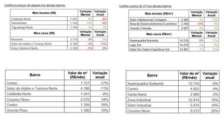Já o bairro de Vicente Pires aparece no levantamento com o maior incremento de preço interanual (19%), seguido do Centro e Cruzeiro Novo.