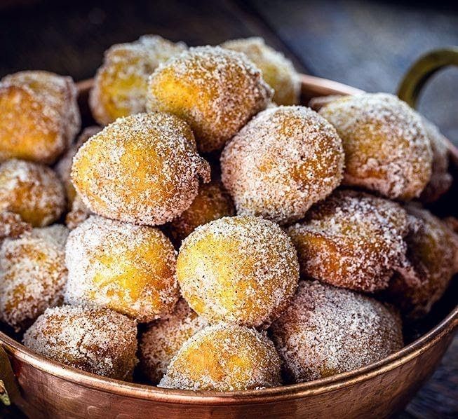 Escorra os bolinhos em papel-toalha e, em seguida, polvilhe-os com açúcar demerara e canela.